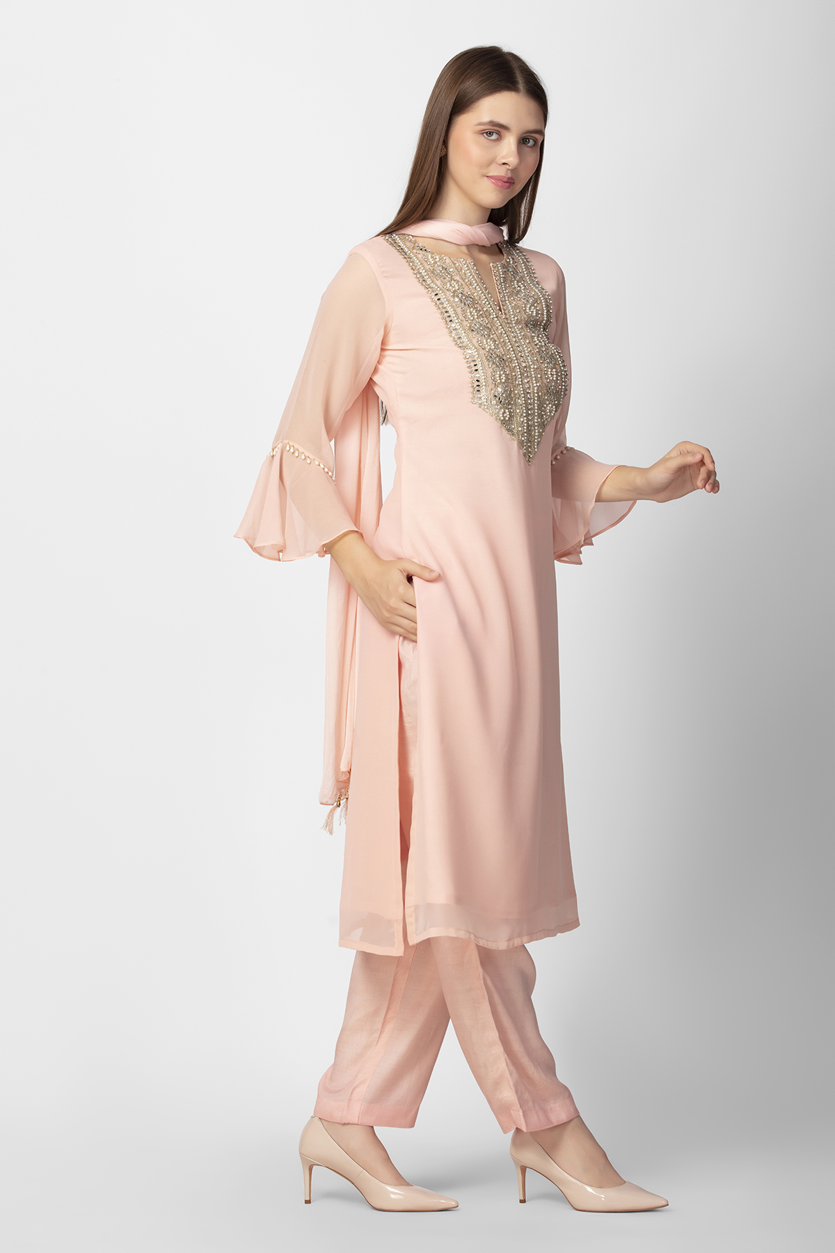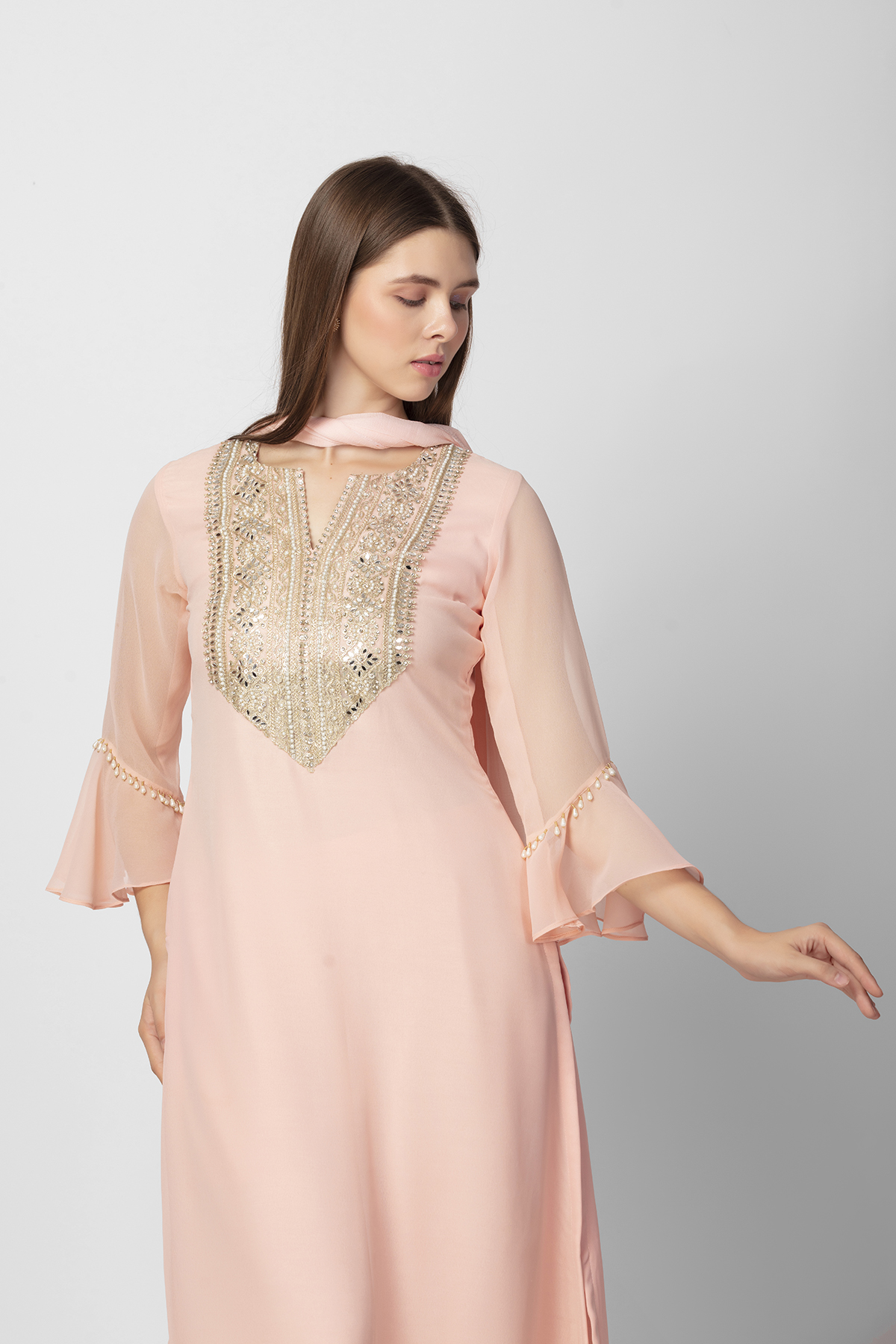 Peach georgette kurti pant 5 out of 5 based on 1 customer rating Product Details Peach georgette kurti with heavy moti and diamond work yoke pattern with drop pearl tassals on ruffle sleeves paired with shantoon palazzo