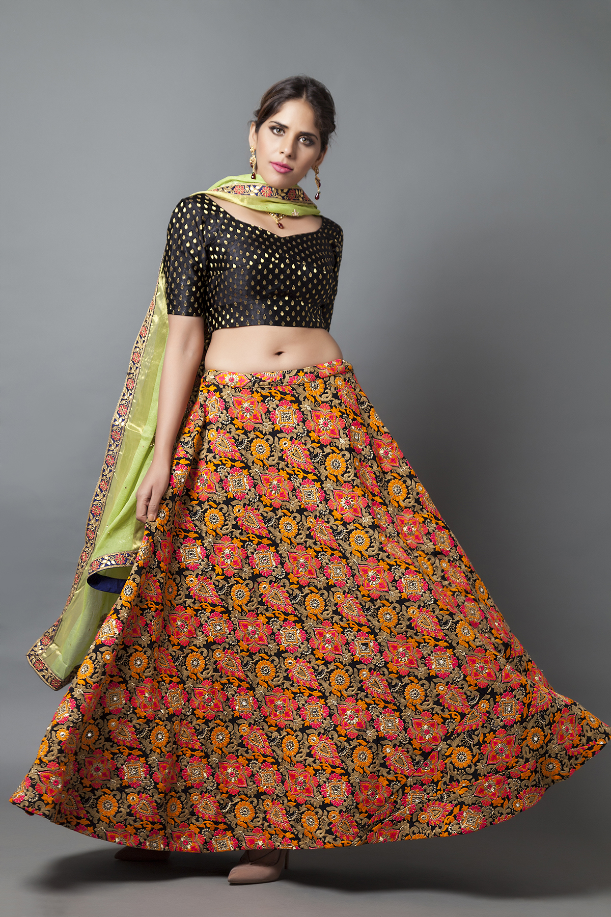 Multicolor lehenga with brocade blouse 5 out of 5 based on 1 customer rating Product Details Multicoloured floral thread work embroidered Lehenga paired with black brocade blouse and green soft tissue dupatta