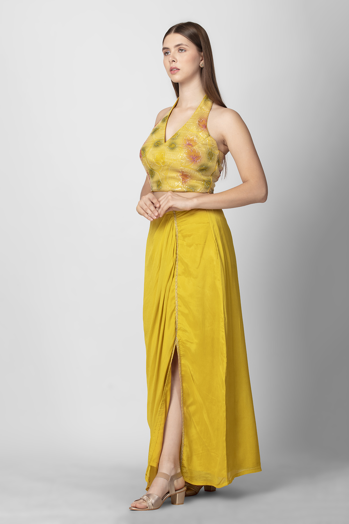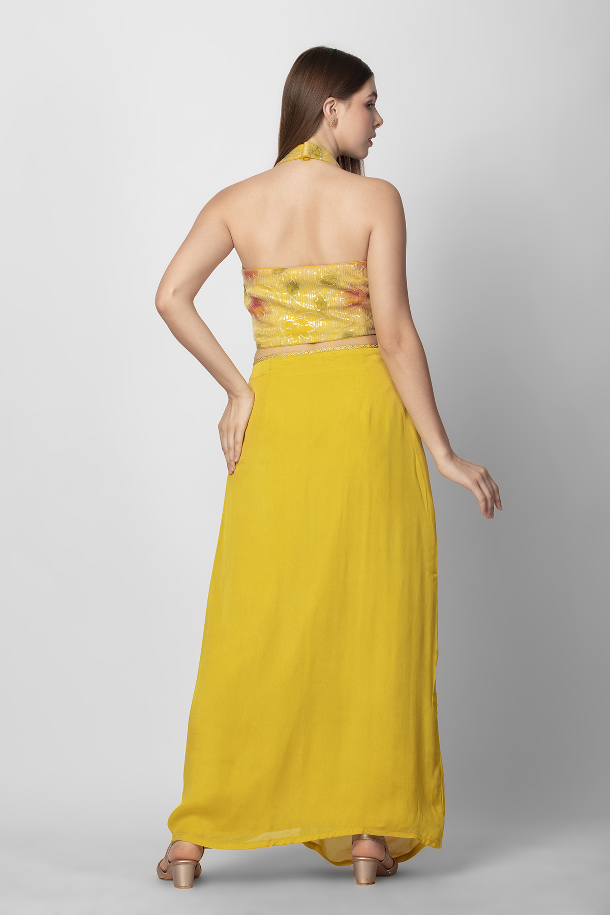 Gold lemon colour chinon ruched skirt paired with halter neck blouse highlighted with multicoloured floored sequin work and flowy shrug with a slim lace border to complete the look