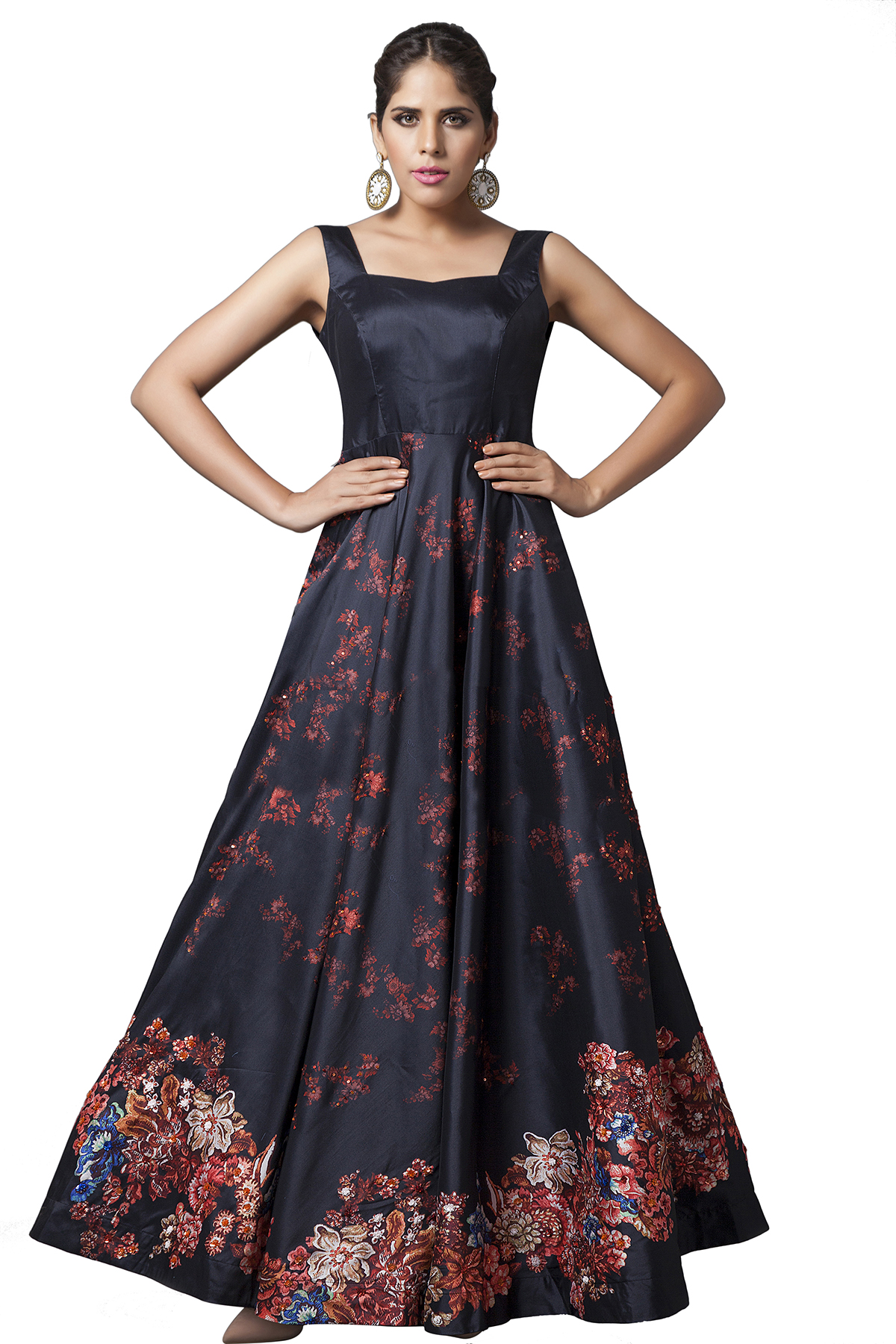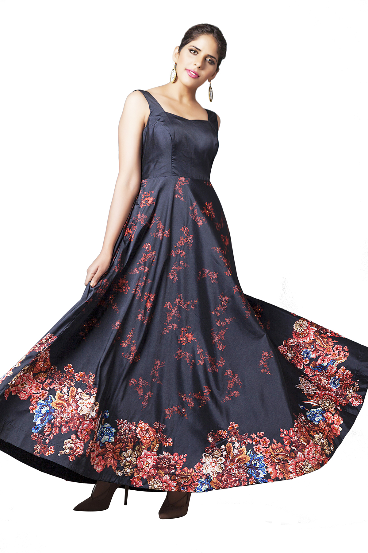 Taffeta full flared black gown with Edwardian vintage print in vibrant color and multicolor sequin embroidery