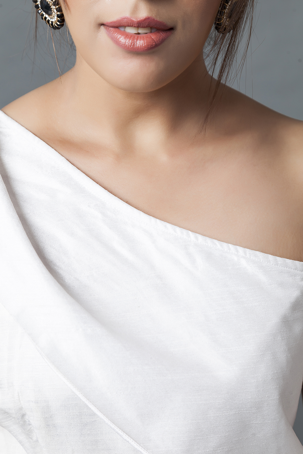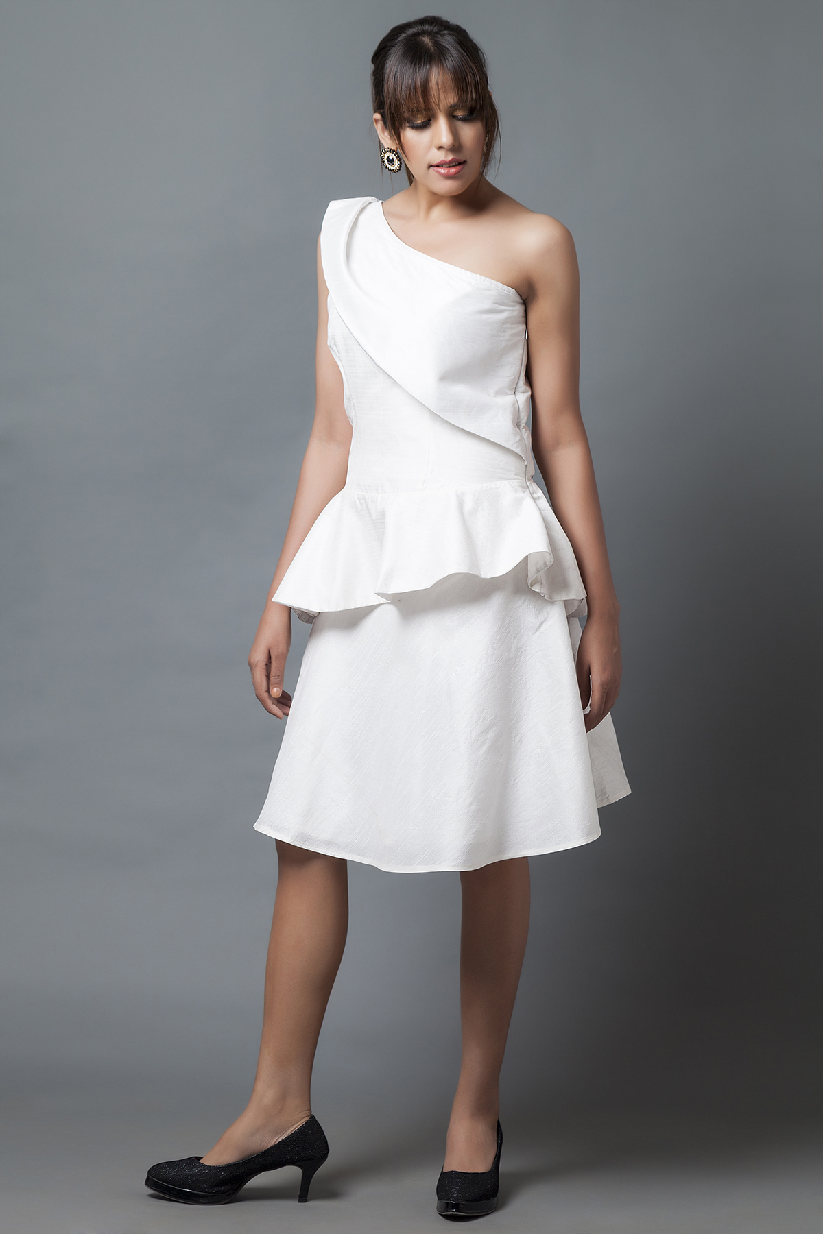 One shoulder peplum top 5 out of 5 based on 1 customer rating Product Details One shoulder white dupion peplum top paired with flared skirt