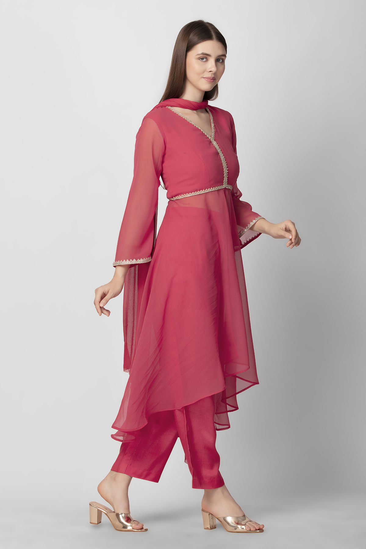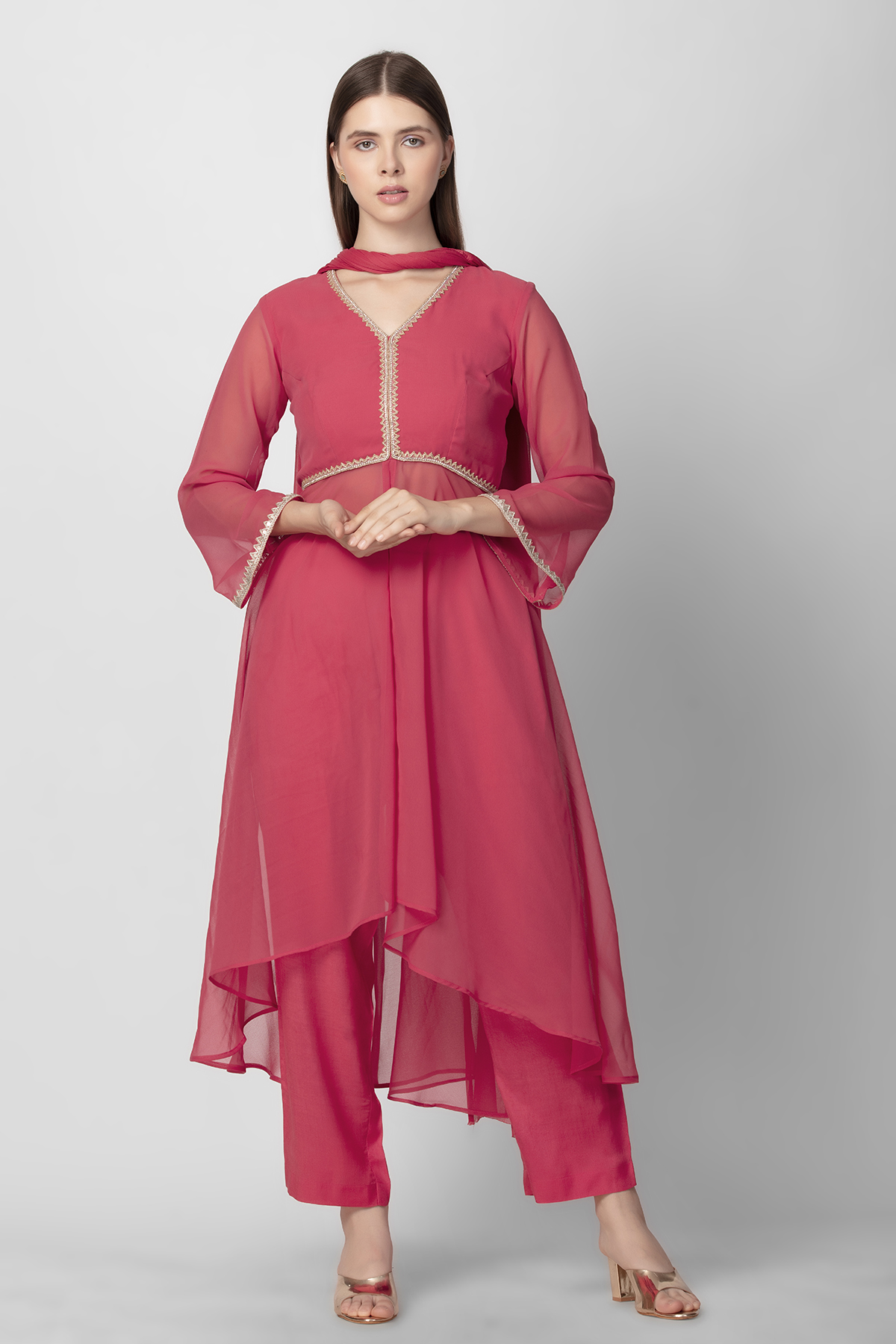 Rose pink front Slit flared kurti pant 5 out of 5 based on 1 customer rating Product Details deep rose pink high low georgette flared kurti with handwork lace on neckline paired with shantoon palazzo