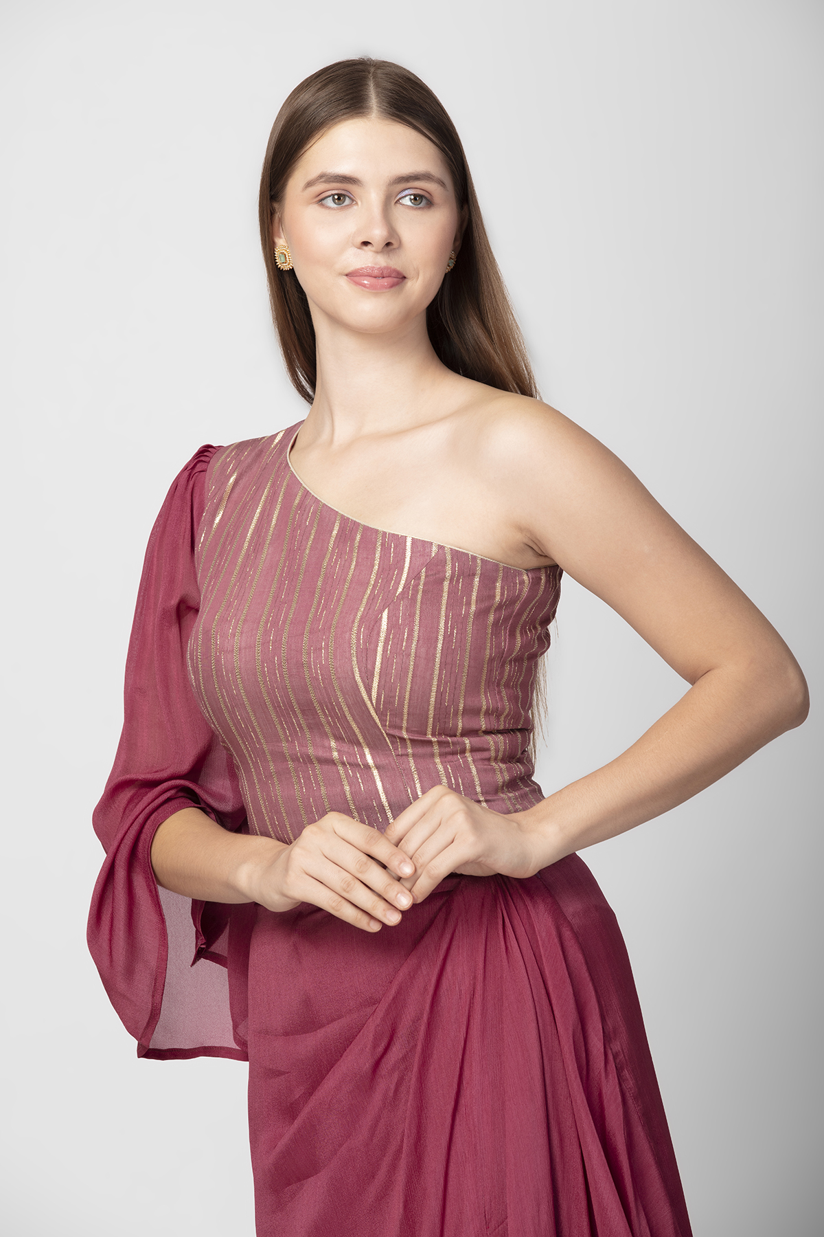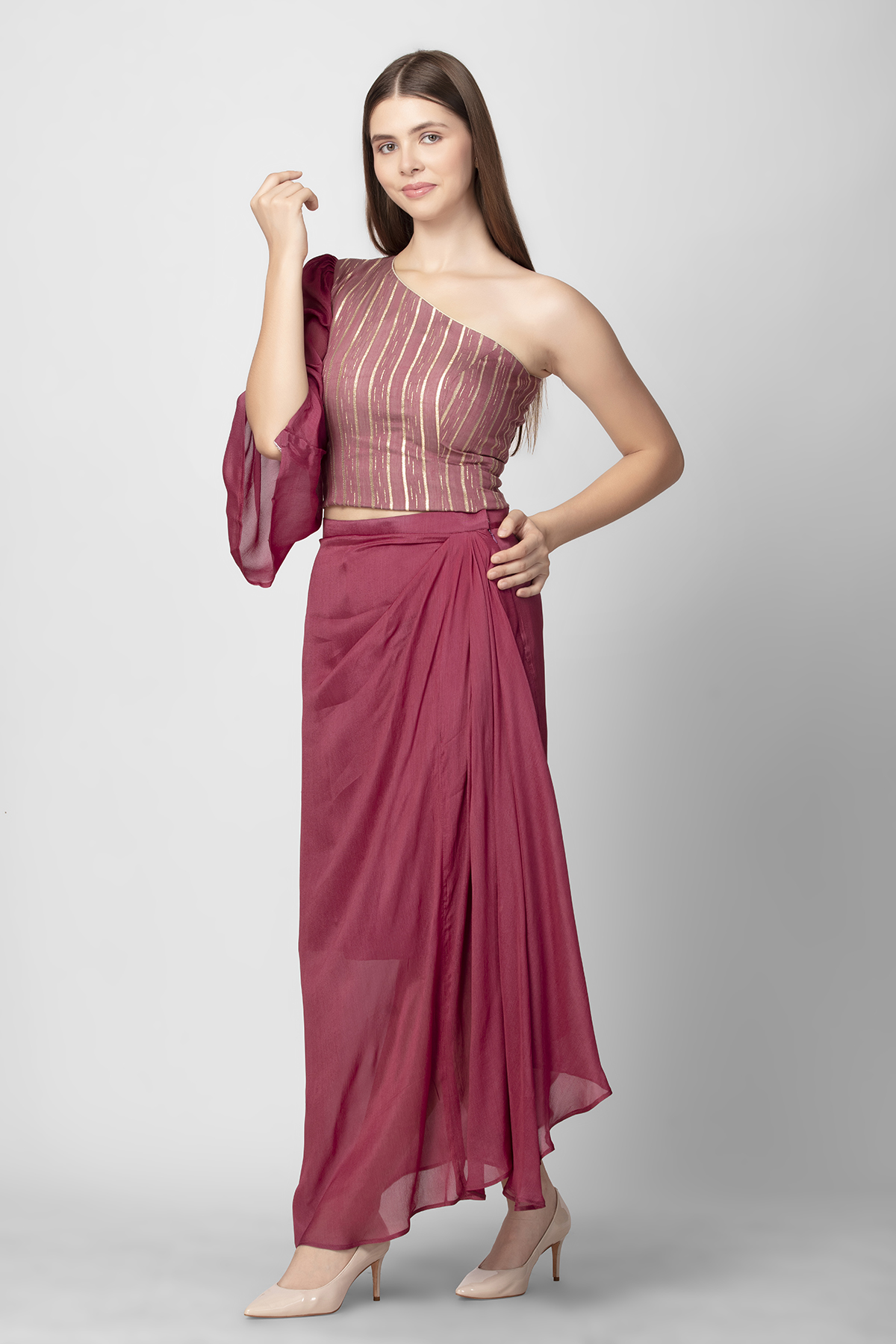 Rouge pink drape skirt 5 out of 5 based on 1 customer rating Product Details Rouge pink chinon silk one sided drape skirt paired with one shoulder brocade silk crop top with flare sleeves.