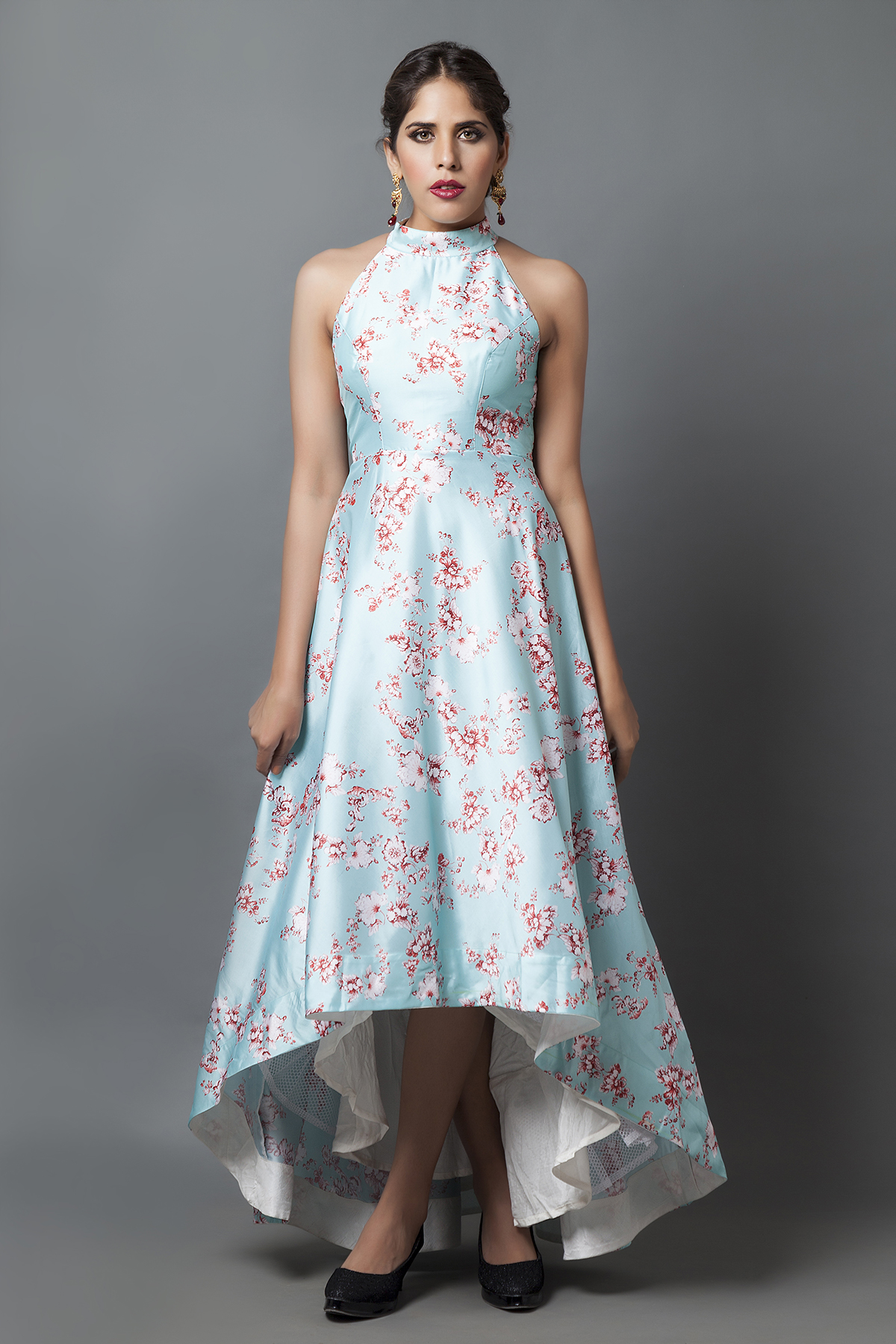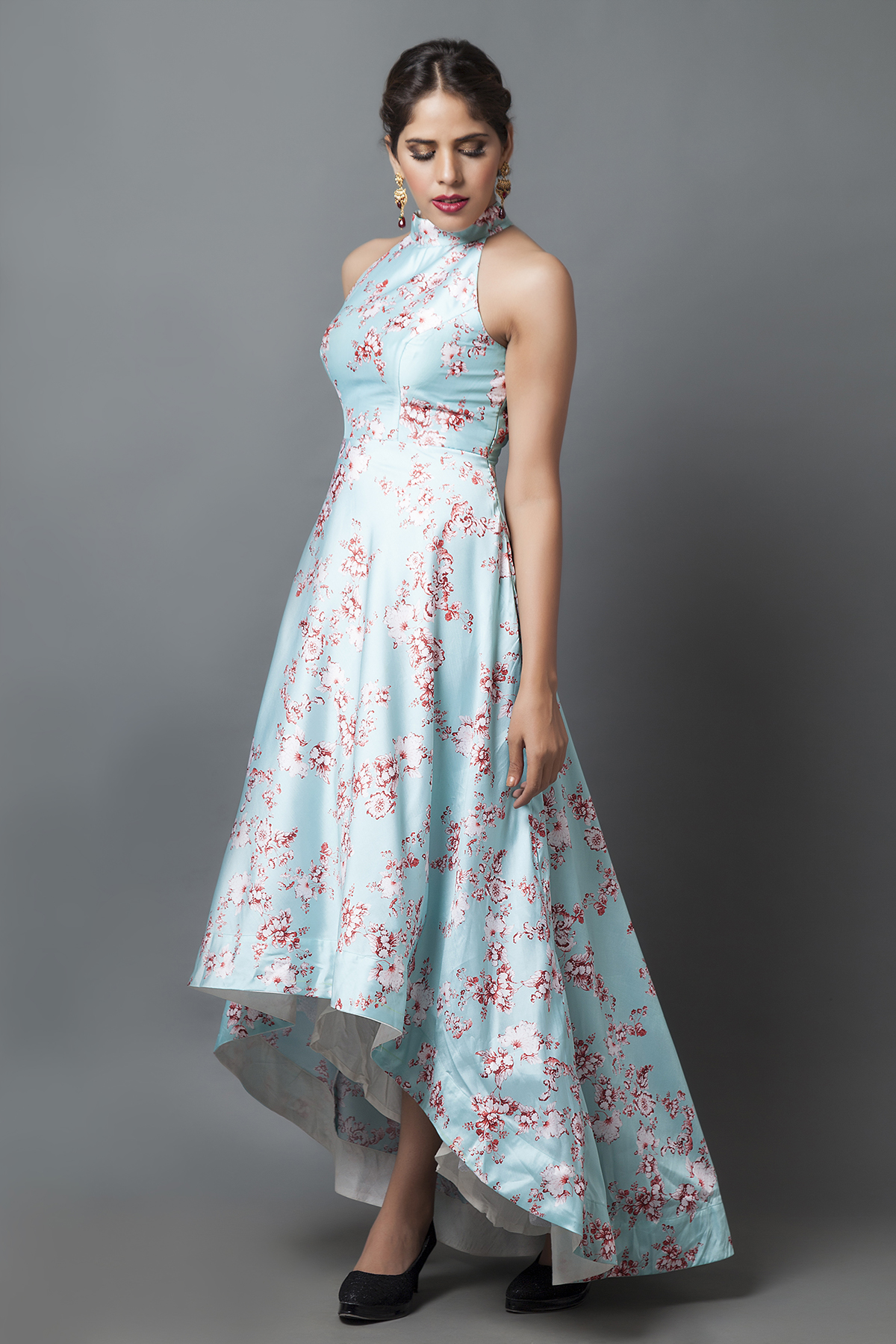 High-Low taffeta silk halter neck mint gown in edwardian print