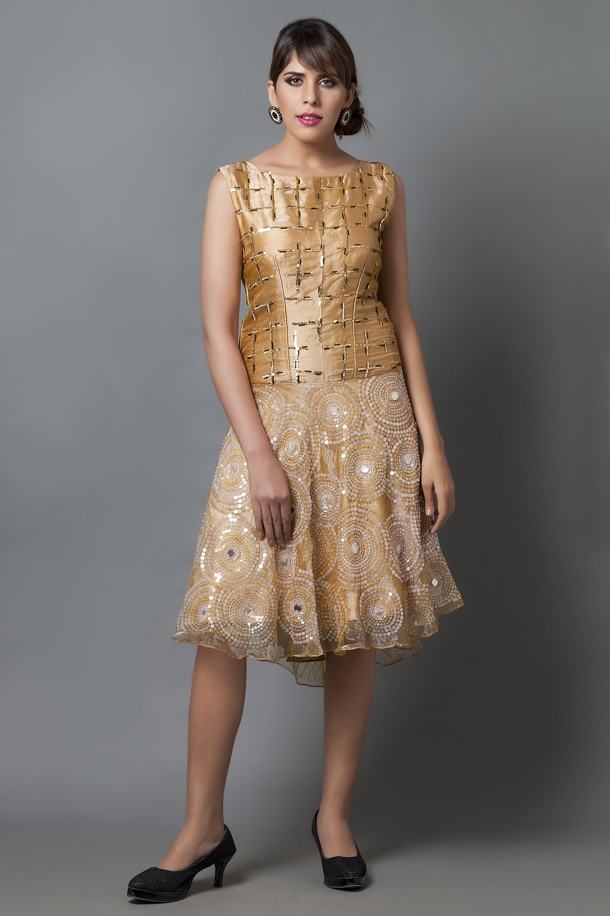 Golden flared dress 5 out of 5 based on 1 customer rating Product Details Golden glass tissue dress with a refreshing high low cut and sparkling sequin work .